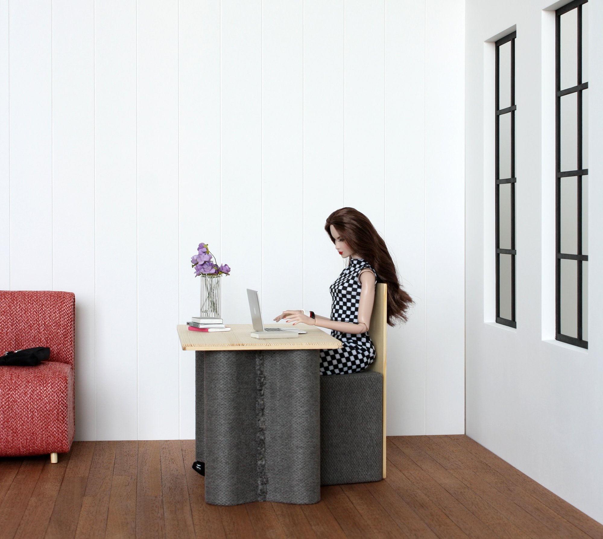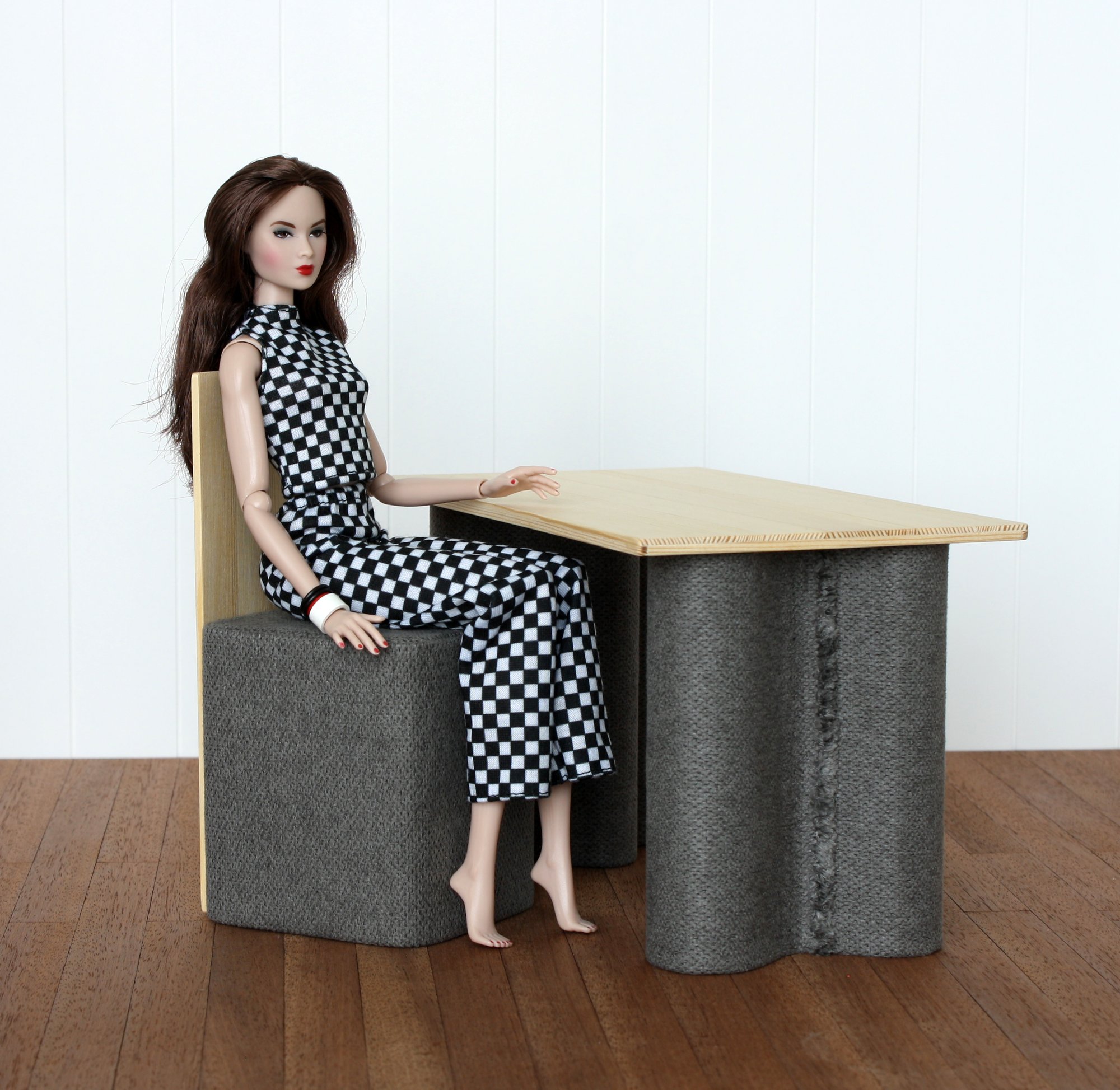 Handcrafted desk and chair set, perfectly proportioned for 13″ fashion dolls such as Integrity Toys/FR, and similar figures. Designed for style and realism, it’s ideal for modern roombox interiors, dollhouse displays, or professional doll photography.