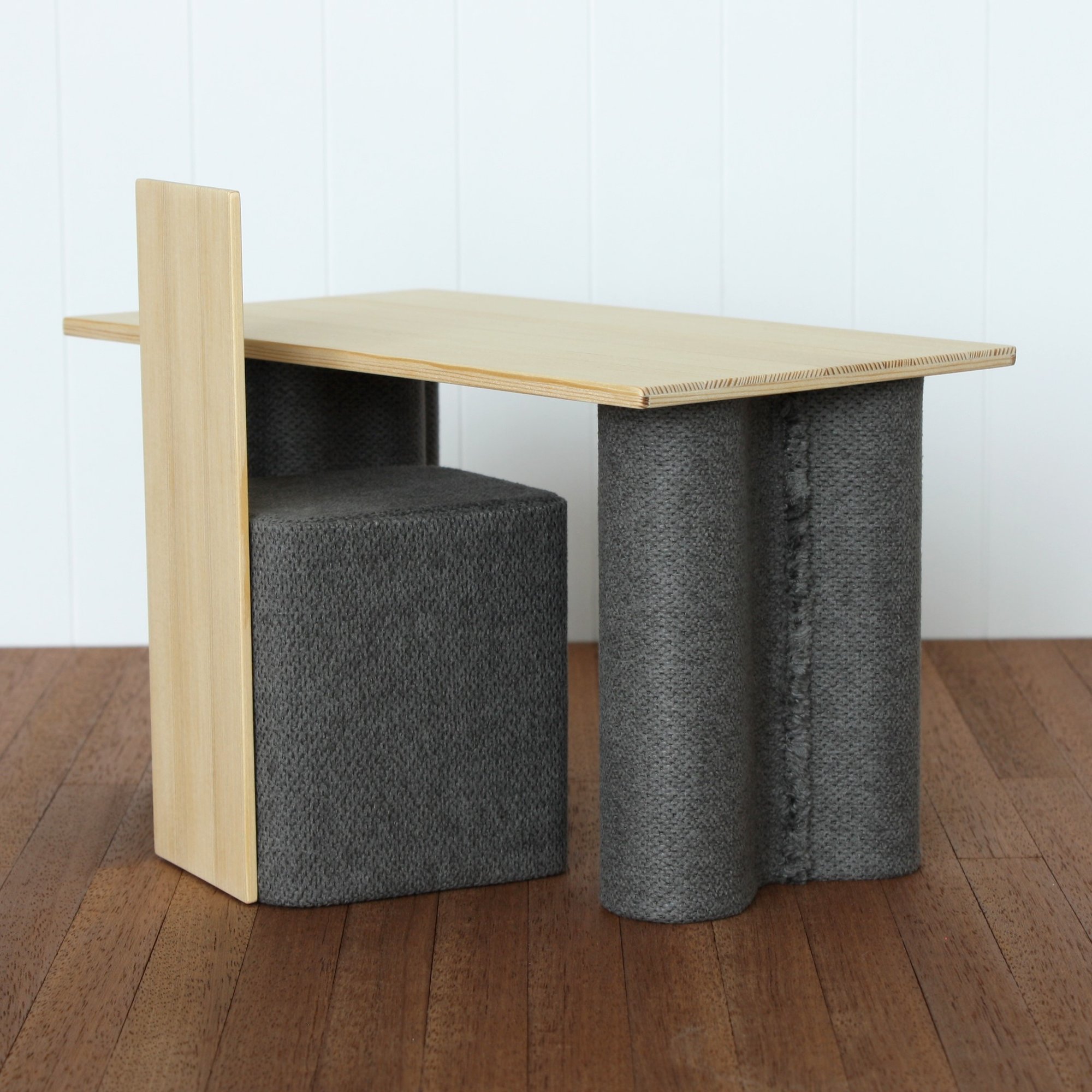 Materials: pine wood, wood-based board, thick cardboard, fabric upholstery.